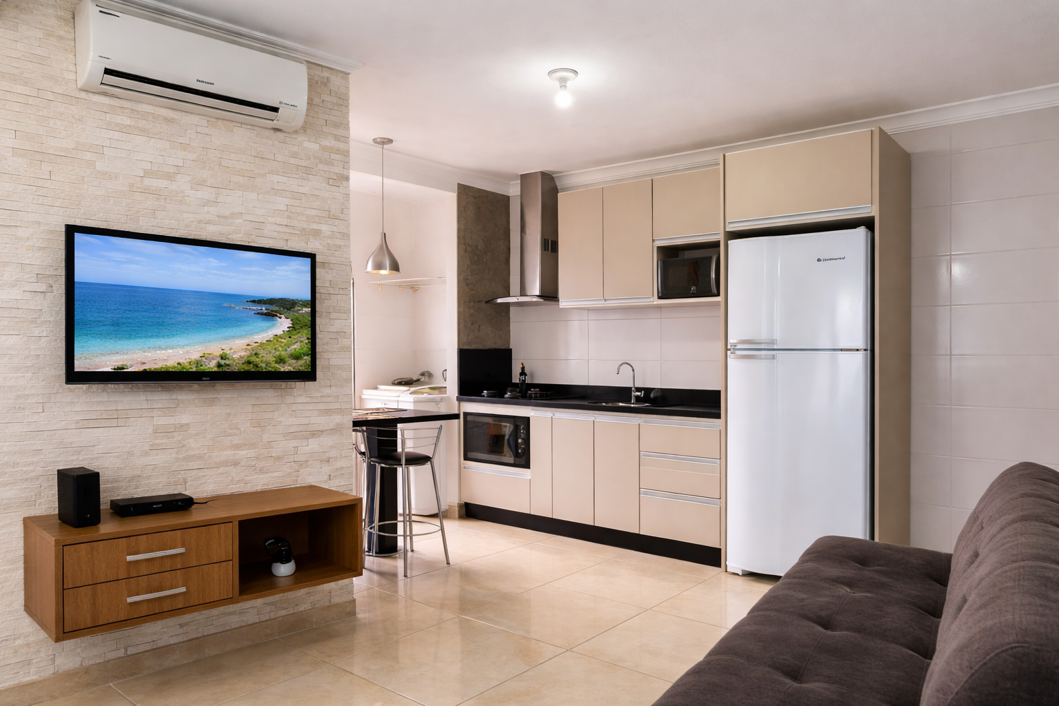 Este estúdio foi pensado para quem deseja unir descanso e praticidade — seja para férias relaxantes ou para trabalhar perto do mar com Wi-Fi rápido e confiável.